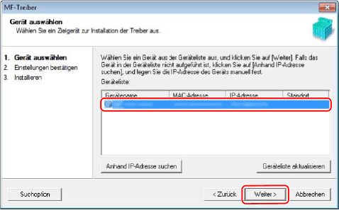 Wenn das Gerät in der [Geräteliste] nicht angezeigt wird, überprüfen Sie den Verbindungsstatus zwischen Computer und Gerät sowie die IP-Adresseinstellungen und klicken Sie auf [Geräteliste aktualisieren]. Wenn das Gerät weiterhin nicht angezeigt wird, klicken Sie auf [Anhand IP-Adresse suchen] → Geben Sie die IP-Adresse des Geräts ein → Klicken Sie auf [OK]. Informationen zur Bestätigung der IP-Adresse finden Sie im Handbuch zum Gerät.
