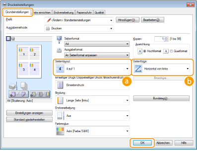 Sie können mehrere Seiten auf ein Blatt drucken. Beispielsweise können Sie mit [4 auf 1] oder [9 auf 1] vier bzw. neun Seiten auf ein Blatt drucken. Diese Funktion ist nützlich, wenn Sie Papier sparen oder die Dokumente als Miniaturbilder drucken wollen.