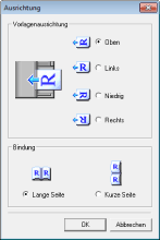 Wenn Dokumente in die Zufuhr eingelegt werden, legen Sie die Ausrichtung der Dokumente unter [Ausrichtung] fest. Sie können auch [Bindung] festlegen, wenn doppelseitige Dokumente in die Zufuhr eingelegt werden.