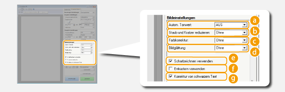 Wenn Sie die Dokumente mit einer OCR-Software oder einer anderen Anwendung scannen, wird der ScanGear MF-Bildschirm möglicherweise nicht angezeigt. In solch einem Fall wird das Dokument mit der Einstellung der verwendeten Anwendung gescannt. Wenn die Anwendung aber nicht über die folgenden Einstellungen verfügt, sollten Sie sie hier aktivieren, sodass diese Einstellungen auf den Scanvorgang angewendet werden.