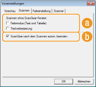 Der Bildschirm [ScanGear MF] wird automatisch geschlossen, nachdem der Scanvorgang abgeschlossen ist. Der Bildschirm wird bei einigen Anwendungen möglicherweise unabhängig von dieser Einstellung automatisch geschlossen.