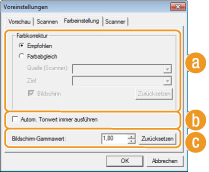 Sie können das Dokument mit einem geeigneten Helligkeitspegel anzeigen, indem Sie den Gammawert des Computerbildschirms angeben, auf dem das gescannte Bild angezeigt wird. Diese Einstellung wird angewendet, wenn Sie [Farbmodus] auf [Farbe] oder [Graustufen] setzen.