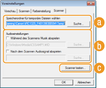 Sie können Musik oder Signaltöne einstellen, die während des Scannens oder beim Abschluss des Scannens wiedergegeben werden. Klicken Sie auf [Suche], um eine wiederzugebende Datei auszuwählen. Die folgenden Dateiformate werden unterstützt: