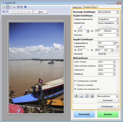 Wenn Sie auf die Registerkarte [Erweiterter Modus] des Bildschirms ScanGear MF klicken, können Sie umfangreichere Einstellungen der Bildqualität als im einfachen Modus vornehmen. Sie können auch erweiterte Einstellungen als "Bevorzugte Einstellungen" registrieren. Weitere Informationen erhalten Sie, wenn Sie auf das Symbol