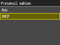 ![]() ![]() Wenn Sie DHCP zur Zuweisung einer IP-Adresse nicht verwenden möchten Wählen Sie <Aus>. Wenn Sie <DHCP> wählen und dieser Dienst nicht verfügbar ist, durchsucht das Gerät das Netzwerk unnötigerweise nach diesem Dienst, was Zeit und Kommunikationsressourcen beansprucht. |