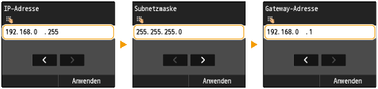 <Subnetzmaske> <Gateway-Adresse>.Geben Sie mit den Zahlentasten die Einstellung ein, und tippen Sie auf jedem Bildschirm auf <Anwenden>.