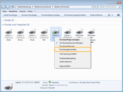 Klicken Sie mit der rechten Maustaste auf das Drucker- oder Faxsymbol, und klicken Sie dann auf [Druckereigenschaften] (bzw. [Eigenschaften]).