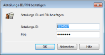 Wenn die Verwaltung per Abteilungs-IDs aktiviert ist und Sie versuchen, von einem Computer aus zu drucken oder zu faxen, wird der folgende Popup-Bildschirm angezeigt (es sei denn, das Kontrollkästchen [Abteilungs-ID/PIN bestätigen, wenn gedruckt wird]/[Abteilungs-ID/PIN beim Senden von Faxen bestätigen] ist deaktiviert):