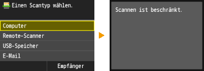 Wenn das Kontrollkästchen [Scan beschränken] aktiviert ist, ist das Speichern gescannter Dokumente auf USB-Speichergeräten, in gemeinsamen Ordnern und auf Dateiservern bzw. das Senden gescannter Dokumente per E-Mail deaktiviert. Sie können auch das Speichern gescannter Dokumente auf Computern über <Computer> und <Remote-Scanner> deaktivieren. Allerdings können Sie das Speichern gescannter Dokumente auf Computern nur für alle Anwender deaktivieren ( Blockieren von Aufträgen bei unbekannter Abteilungs-ID).