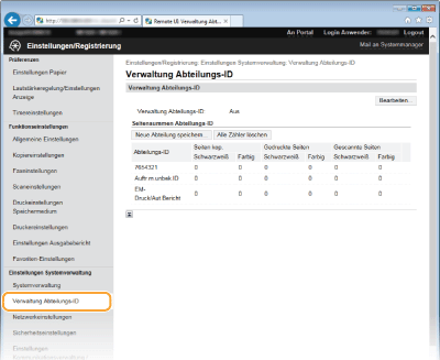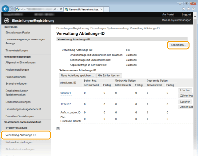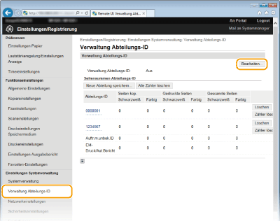 Klicken Sie auf [Verwaltung Abteilungs-ID], und speichern (bzw. bearbeiten) Sie Abteilungs-IDs.