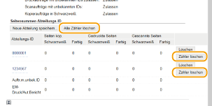 Wenn Sie die Zähler auf Null zurücksetzen möchten, klicken Sie auf den entsprechenden Textlink unter [Abteilungs-ID] und dann auf [Zähler löschen]  [OK]. Wenn Sie die Zähler für alle Abteilungs-IDs auf Null zurücksetzen möchten, klicken Sie auf [Alle Zähler löschen]  [OK].