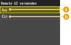 Remote UI ist nützlich, wenn Sie die Geräteeinstellungen über einen Webbrowser auf einem Computer festlegen können. Das Gerät muss mit einem Computer im Netzwerk verbunden sein, damit Sie Remote UI verwenden können. Wenn das Gerät über USB mit einem Computer verbunden ist oder wenn Sie Remote UI nicht benötigen, können Sie Remote UI deaktivieren und so das Risiko verringern, dass ein böswilliger Dritter das Gerät über das Netzwerk fernsteuert.