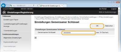 Geben Sie bis zu 24 alphanumerische Zeichen für den Pre-Shared-Key ein, und klicken Sie auf [OK].