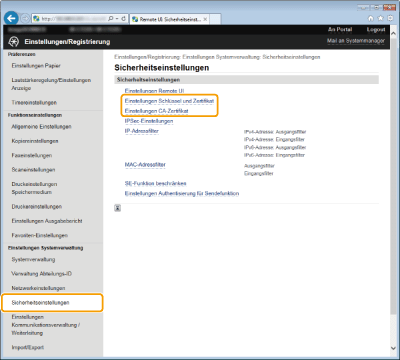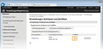 [Einstellungen Schlüssel und Zertifikat] (bei Schlüsselpaaren) oder [Einstellungen CA-Zertifikat] (bei Zertifizierungsstellenzertifikaten).