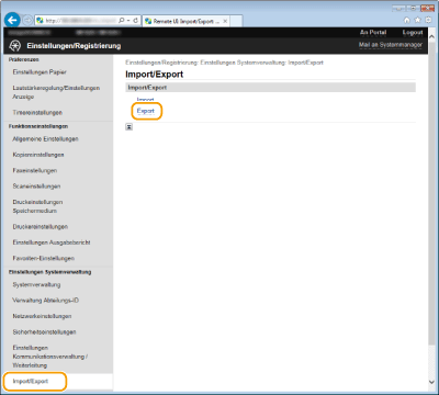 Sie können die Einstellungsdaten der Menüoptionen auf dem Computer speichern oder die gespeicherten Daten beim Gerät registrieren. Die exportierten Daten können importiert werden. Wenn Sie das gleiche Modell verwenden, können andere Geräte die von diesem Gerät exportierten Daten importieren und umgekehrt. Dieser Vorgang kann nur durchgeführt werden, wenn Sie im Systemmanager-Modus angemeldet sind.