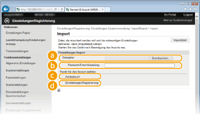 Die angegebenen Einstellungen werden in das Gerät importiert.