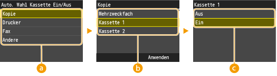 ). Für das Drucken auf Papier, das über das Mehrzweckfach zugeführt wird, ist die automatische Papierkassettenauswahl immer aktiviert.