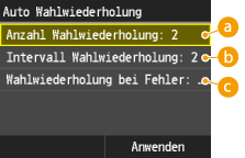 Legen Sie die Einstellungen für die automatische Wahlwiederholung fest. Bei dieser Funktion wird eine Faxnummer, die beim ersten Wählversuch aufgrund einer besetzten Leitung nicht erreicht wurde, nach mehreren Minuten automatisch erneut gewählt. Sie können die Anzahl an Wahlwiederholungen und das Intervall zwischen den Wahlwiederholungen festlegen.