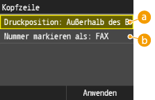 Legt die Position fest, an der die Kopfzeile im gesendeten Fax gedruckt wird. Wählen Sie <Innerhalb des Bildbereiches>, wenn die Informationen im Bildbereich gedruckt werden sollen, oder <Außerhalb des Bildbereiches>, um die Informationen außerhalb des Bildbereichs zu drucken.