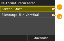 Legen Sie die Einstellungen für die Verkleinerung des Bildformats eines empfangenen Dokuments fest. Sie können einen automatischen Verkleinerungsfaktor auswählen, mit dem das empfangene Dokument auf das Format des eingelegten Papiers verkleinert wird. Sie können auch einen Faktor aus einer Liste auswählen.