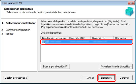 Si no se muestra el dispositivo en [Lista de dispositivos], compruebe el estado de conexión entre el ordenador y el dispositivo y la configuración de la dirección IP, y haga clic en [Actualizar lista de dispositivos]. Si el dispositivo aún no se muestra, haga clic en [Buscar por dirección IP] → escriba la dirección IP del dispositivo → haga clic en [Aceptar]. Para conocer el método de confirmación de la dirección IP, consulte el manual del dispositivo.