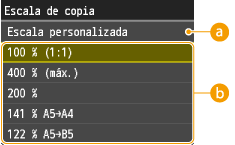 Puede ampliar o reducir las copias utilizando una escala de copia preestablecida, como por ejemplo <A5->A4>, o estableciendo una escala de copia personalizada en incrementos del 1%.