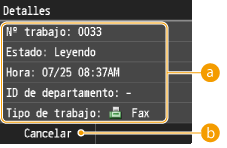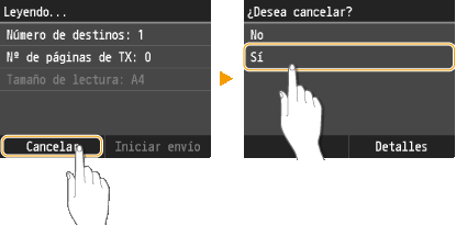 Si desea cancelar el envío de faxes inmediatamente después de pulsar  , pulse <Cancelar> en la pantalla o pulse  . También puede cancelar el envío de faxes después de comprobar el estado del fax.