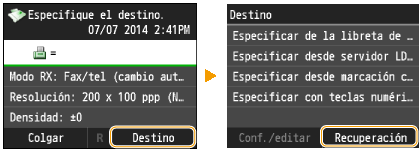 Puede seleccionar un destino entre los tres últimos destinos utilizados. Cuando se especifica un destino utilizado anteriormente, el equipo también configura las mismas opciones de fax utilizadas la última vez que se enviaron documentos a dicho destino, como por ejemplo la densidad.