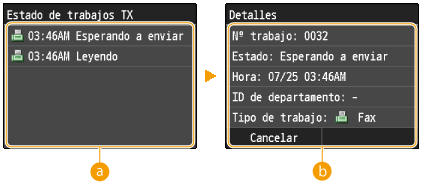 ![]() <Estado de trabajos TX>/<Estado de trabajos RX>Muestra la lista de documentos que se están enviando y recibiendo o que están a la espera de procesarse.