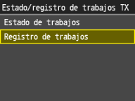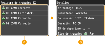 ![]() <Registro de trabajos TX>/<Registro de trabajos de RX>Muestra la lista de los documentos enviados y recibidos. <Correcto> aparece cuando un documento se envía o recibe correctamente, y <Error> aparece cuando un documento no se envía o recibe correctamente porque se canceló o se produjo algún error.