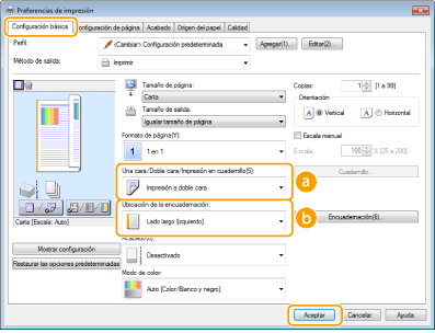 Especifique la posición de encuadernación de las impresiones con una herramienta de encuadernación como una grapadora. La orientación de la impresión cambiará en función de la posición de encuadernación especificada. Para especificar la anchura del margen de la posición de encuadernación, haga clic en [Encuadernación].