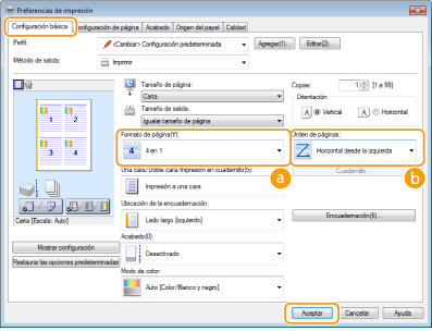 Puede imprimir varias páginas en una única hoja. Por ejemplo, puede imprimir cuatro o nueve páginas en una única hoja utilizando [4 en 1] o [9 en 1]. Utilice esta función si desea ahorrar papel o ver sus documentos en miniaturas.