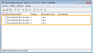 Con la ayuda de Canon PageComposer, puede combinar varios documentos en un trabajo de impresión e imprimir el trabajo con las opciones de impresión especificadas. Esta función, por ejemplo, le permite combinar documentos creados con diferentes aplicaciones e imprimir todas las páginas con el mismo tamaño de papel.