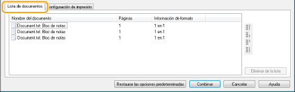 Haga clic en la pestaña [Lista de documentos] para mostrar los documentos añadidos en los pasos del 1 al 4. Puede quitar documentos seleccionándolos en la lista y haciendo clic en [Eliminar de la lista].