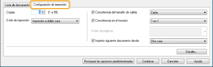 Haga clic en la pestaña [Configuración de impresión] para mostrar la pantalla de especificación de las opciones de impresión, como el número de copias o la impresión a una cara/doble cara. Las opciones especificadas aquí se aplican a todo el trabajo de impresión.