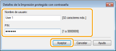 Compruebe el nombre del documento, el nombre de usuario y el PIN, y haga clic en [Aceptar].