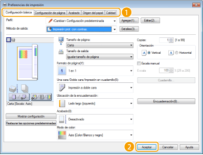 Haga clic en las pestañas [Configuración básica], [Configuración de página], [Acabado], [Origen del papel] o [Calidad] para especificar las opciones de impresión en cada pantalla según sea necesario.