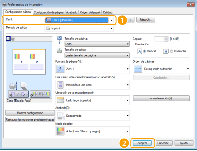 Especificar combinaciones de opciones como "Orientación horizontal a una cara en papel de tamaño A4" cada vez que imprima puede ser una tarea muy tediosa. Si registra estas combinaciones de opciones de impresión tan utilizadas como "perfiles", podrá especificar las opciones de impresión de una forma muy sencilla seleccionando uno de estos perfiles en la lista. Esta sección describe cómo registrar perfiles y cómo imprimir utilizándolos.