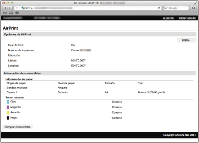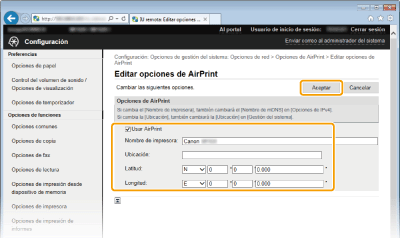 Puede registrar la información, incluido el nombre del equipo y la ubicación de instalación, que se utilice para identificar el equipo. Asimismo, puede deshabilitar la función AirPrint del equipo. Utilice la IU remota para cambiar estas opciones.