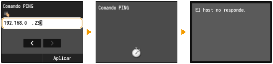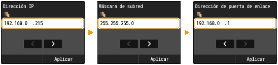 <Máscara de subred> <Dirección de puerta de enlace>.Introduzca la opción utilizando las teclas numéricas, y pulse <Aplicar> en cada pantalla.