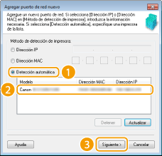 Haga clic en [Detección automática], seleccione el equipo cuando se detecte y haga clic en [Siguiente].