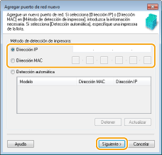 ![]() ![]() Si el equipo no se detecta Haga clic en [Actualizar]. Si el problema persiste, haga clic en [Dirección IP] o [Dirección MAC], introduzca la dirección IP o la dirección MAC del equipo Visualización de las opciones de red y, a continuación, haga clic en [Siguiente].