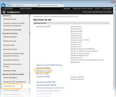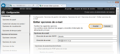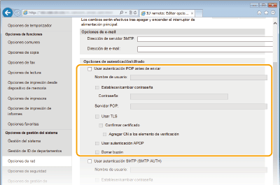 Utilice la IU remota para configurar las opciones de e-mail detalladas, como la autenticación POP antes de SMTP y el cifrado TLS. Para obtener más información sobre las opciones necesarias, póngase en contacto con su proveedor de servicios de Internet o con el administrador de red.