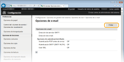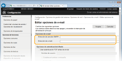 Configuración de la autenticación SMTP o la comunicación cifrada con el servidor SMTP