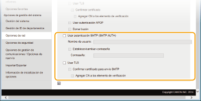 Seleccione la casilla de verificación para utilizar TLS para cifrar la comunicación con el servidor SMTP. Seleccione la casilla de verificación de [Confirmar certificado para envío SMTP] o [Agregar CN a los elemento de verificación] en función de sus necesidades.