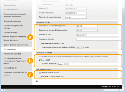 Seleccione la casilla de verificación para actualizar dinámicamente los registros DNS cuando cambie la dirección IP del equipo. Cuando especifique el intervalo entre las actualizaciones, introduzca el tiempo en horas en el cuadro de texto [Intervalo de actualización dinámica de DNS]. [Opciones de mDNS][Usar mDNS]