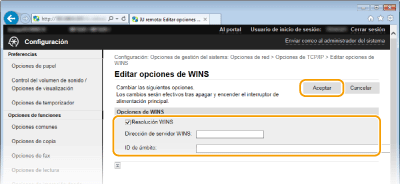 Seleccione la casilla de verificación [Resolución WINS], especifique las opciones necesarias y haga clic en [Aceptar].