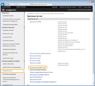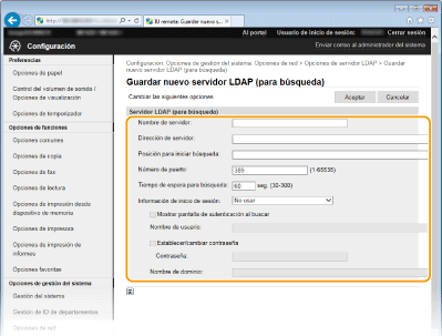 Si se implementa un servidor LDAP en la red, puede buscar números de fax y direcciones de e-mail en el servidor y, a continuación, especificarlos como destinos o registrarlos en la libreta de direcciones. Puede registrar un máximo de cinco servidores LDAP en el equipo. Registre servidores LDAP a través de la IU remota.