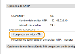 [Opciones de red] [Opciones de TCP/IP] y haga clic en [Comprobar servidor NTP] en [Opciones de SNTP]. Si se ha establecido correctamente una conexión, el resultado se mostrará de la siguiente manera. Tenga en cuenta que esta operación no ajusta el reloj del sistema.![]() |