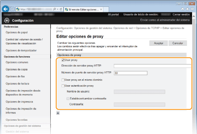 Seleccione la casilla de verificación [Usar proxy] y especifique las opciones necesarias.